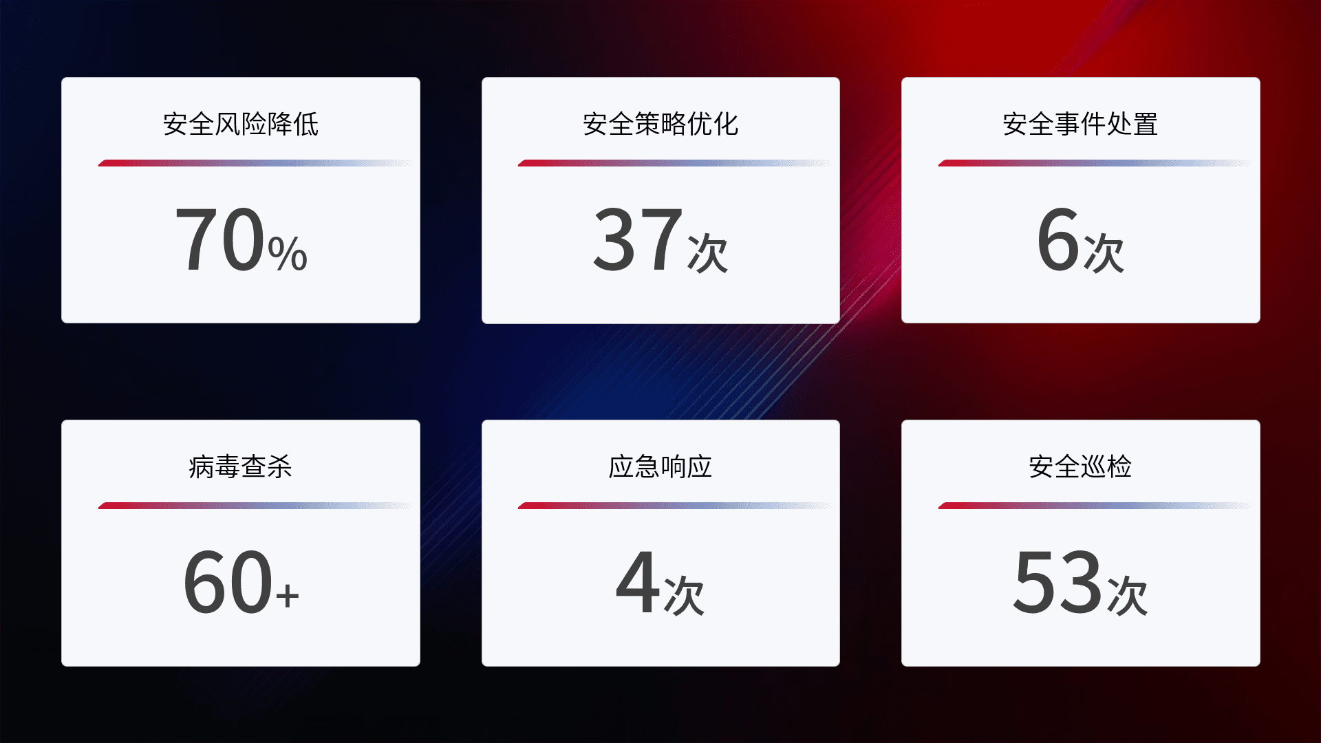 提供全面的安全事件报告体系,,包括处置报告、、、周报、、、季度和年度总结,,,,结合持续监控,,帮助客户深入了解网络安全状况。。。